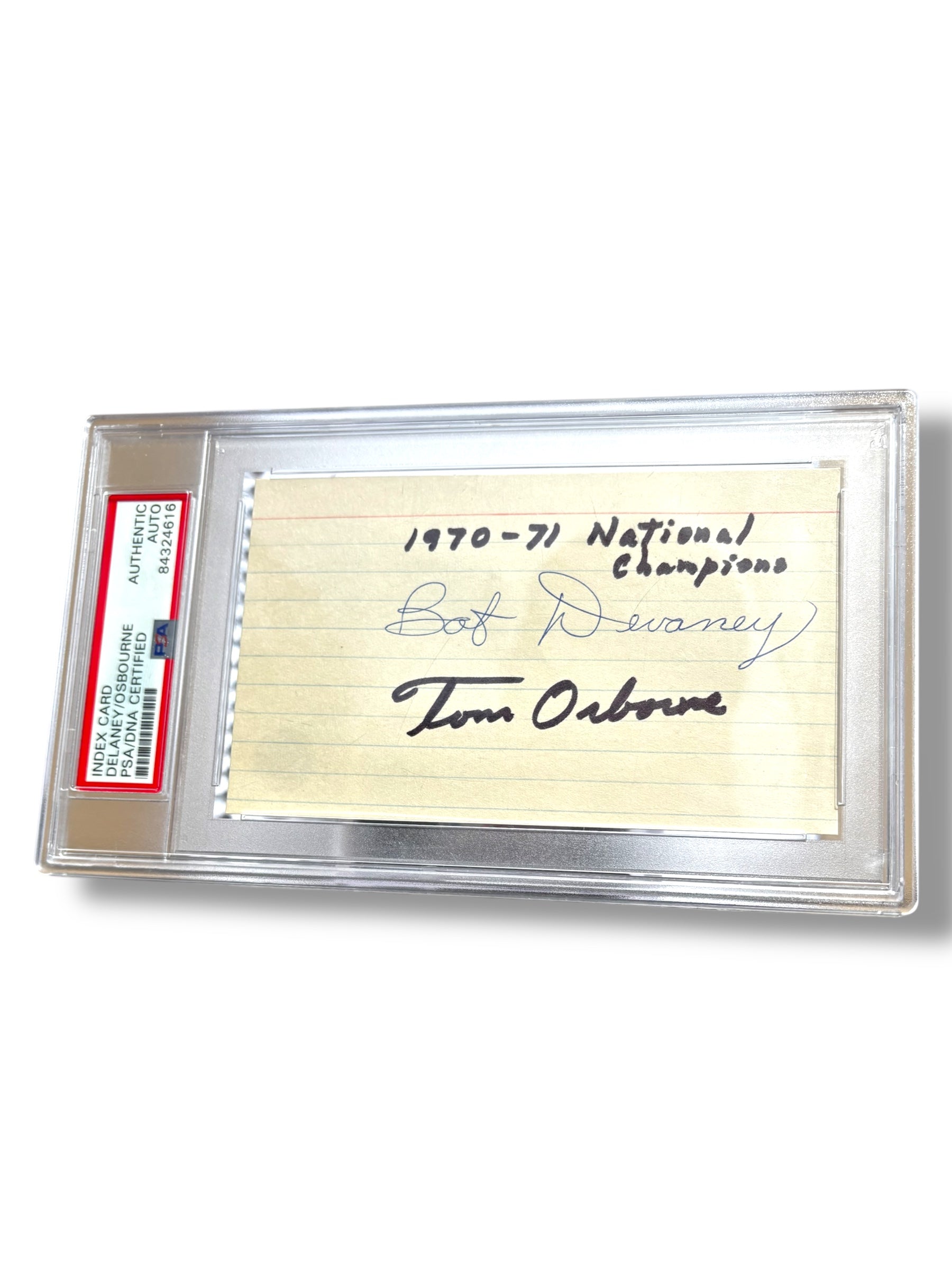 Own a piece of Husker history with this authentic index card signed by Bob Devaney and Tom Osborne, commemorating the 1970-71 national championship seasons. Certified for authenticity, this rare collectible is a must-have for any Nebraska Cornhuskers fan and a testament to the program's rich legacy. Put this in your collection today!