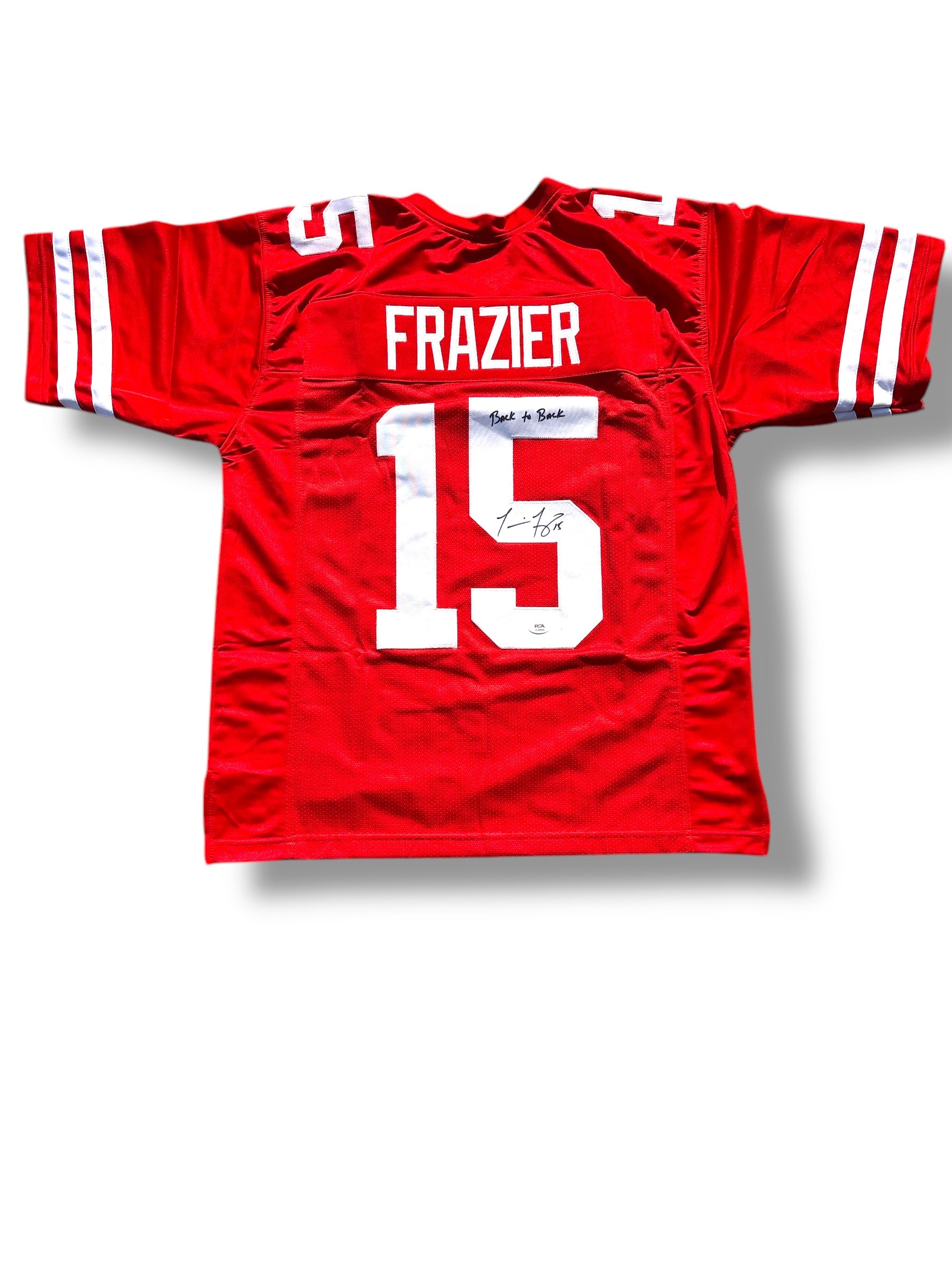 Legendary piece of Husker history! This custom jersey featuring Tommie Frazier's #15 is PSA certified and commemorates his back-to-back championship years. A rare and valuable collectible for any Nebraska Cornhuskers fan, this jersey showcases Frazier's incredible talent and contributions to the program. Get yours today!